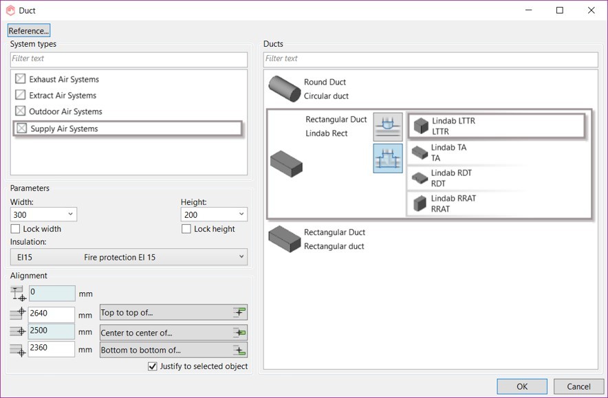 You can easily set up all of your duct drawing preferences in MagiCAD’s dataset, with options for system type, duct series, duct size, insulation, sizing, installation code, status, and alignment.
